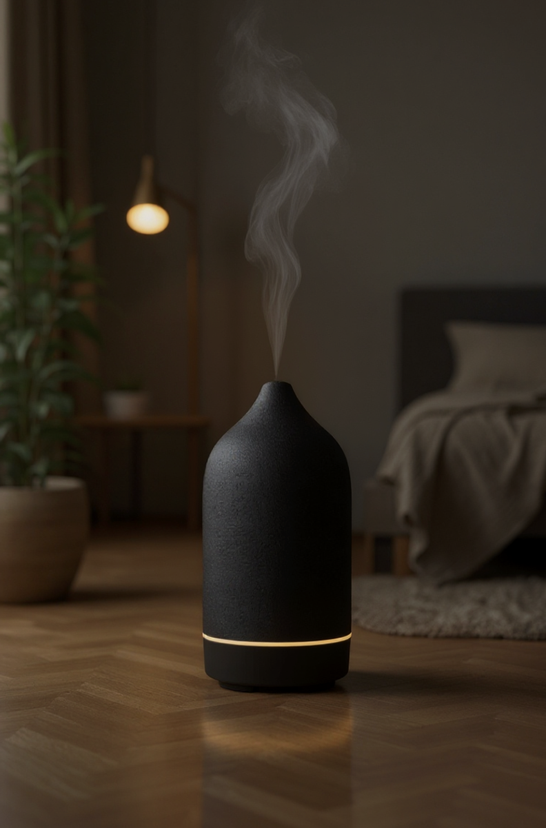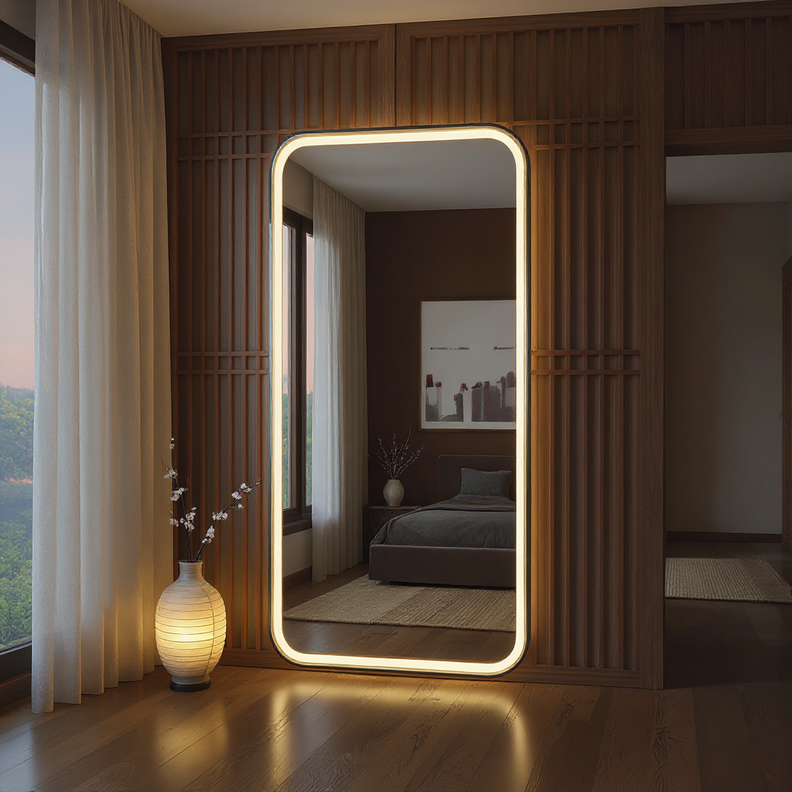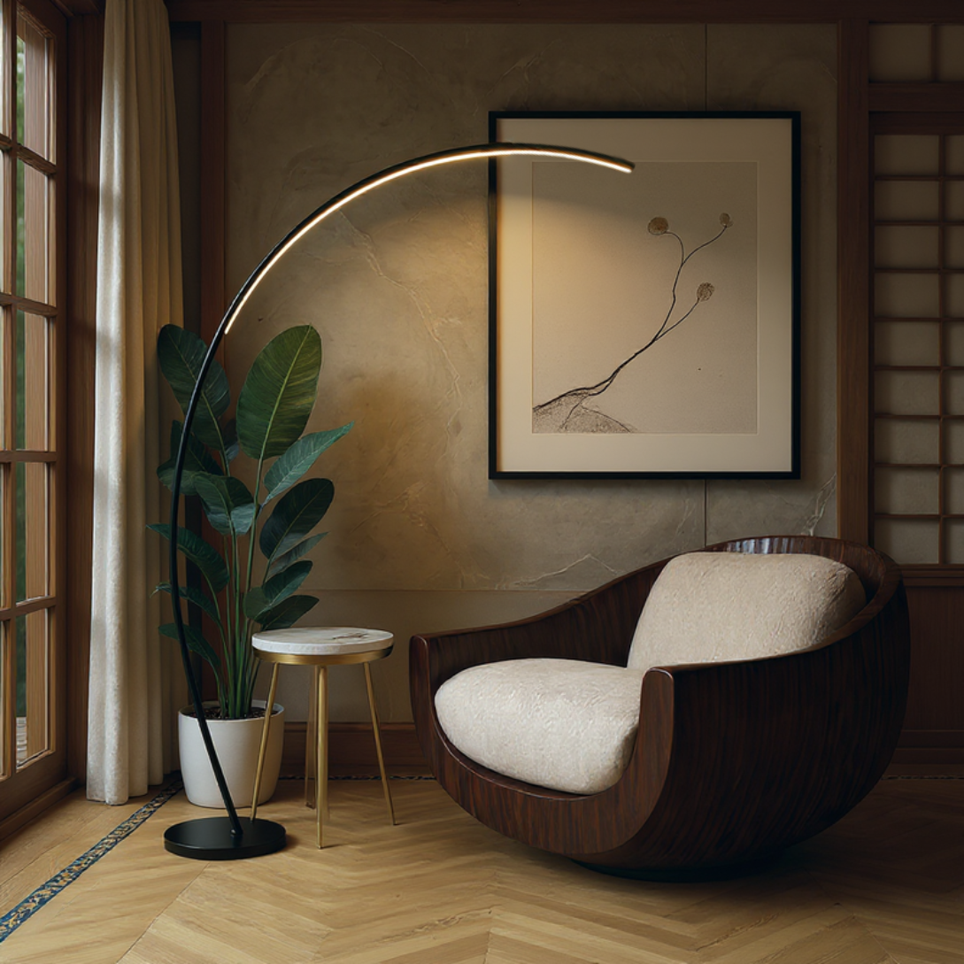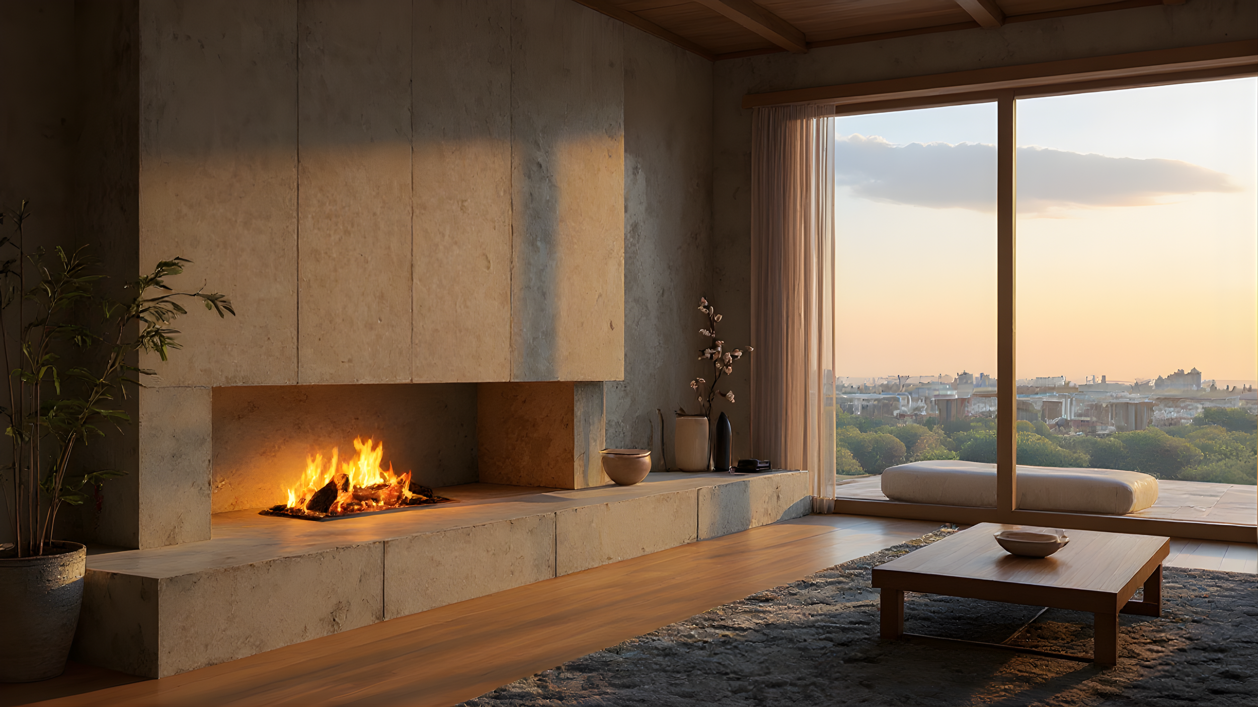 Luxury modern apartment living room with stone fireplace, wood table, city view at sunset. Japandi interior design for high-end homes.