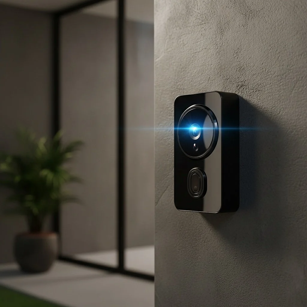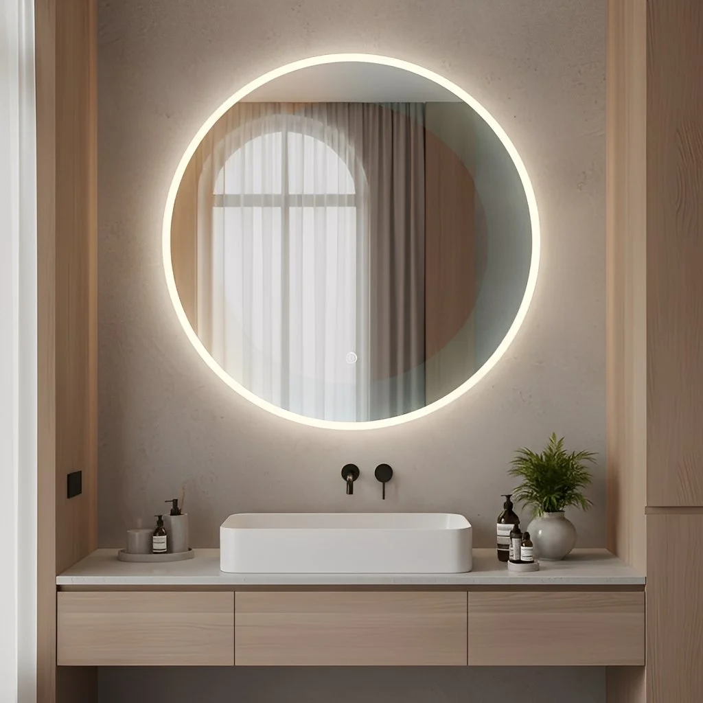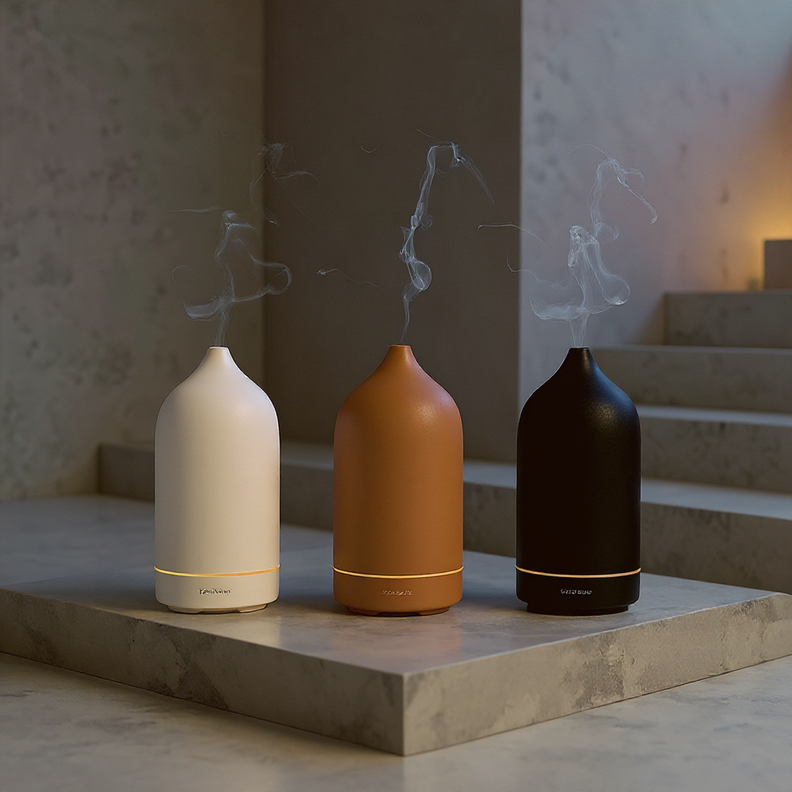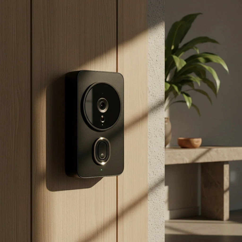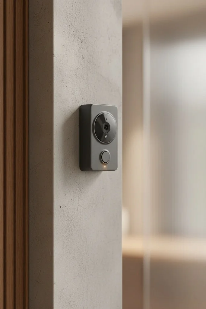 Luxury modern apartment living room with stone fireplace, wood table, city view at sunset. Japandi interior design for high-end homes.
